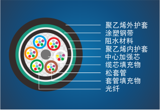 GYTY53 光缆的结构是将 250μm 光纤套入高模量材料制成的松套管中,松套管内填充防水化合物。缆芯的中心是一根金属加强芯,对于某些芯数的光缆来说,金属加强芯外还需要挤上一层聚乙烯(PE)。松套管(和填充绳)围绕中心加强芯绞合成紧凑和圆形的缆芯,缆芯内的缝隙充以阻水填充物。缆芯外挤上一层聚乙烯内护套,双面涂塑钢带(PSP)纵包后挤制聚乙烯护套成缆,双护层结构。