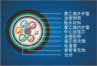 GYTA53 光缆的结构是将 250μm 光纤套入高模量材料制成的松套管中,松套管内填充防水化合物。缆芯的中心是一根金属加强芯,对于某些芯数的光缆来说,金属加强芯外还需要挤上一层聚乙烯(PE)。松套管(和填充绳)围绕中心加强芯绞合成紧凑和圆形的缆芯,缆芯内的缝隙充以阻水填充物。涂塑铝带(APL)纵包后挤一层聚乙烯内护套,双面涂塑钢带(PSP)纵包后挤制聚乙烯护套成缆。